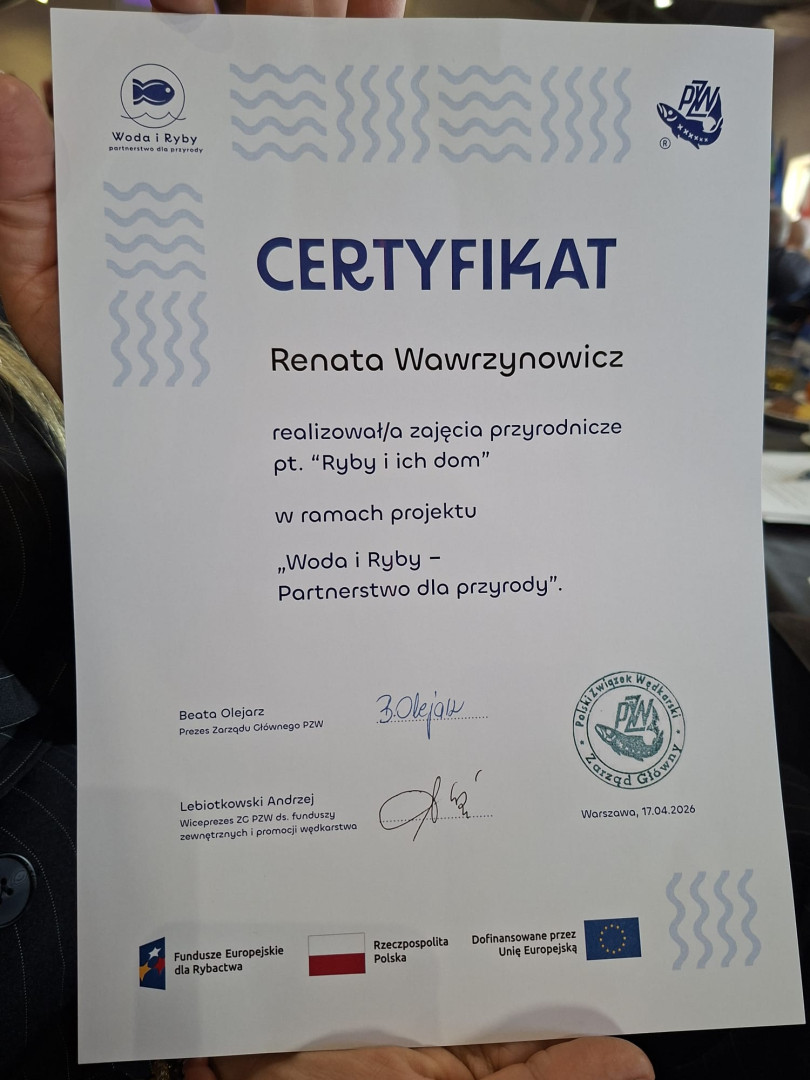 Krajowy Zjazd Delegatów to także okazja do podziękowania za wkład pracy na rzecz PZW, w tym w działalność młodzieżową. Z przyjemnością informujemy, że Koleżanka Renata Wawrzynowicz otrzymała Certyfikat za realizację w naszym Okręgu zajęć pt. "Ryby i ich dom" w ramach ogólnopolskiego projektu "Woda i ryby. Partnerstwo dla przyrody." Serdecznie gratulujemy!